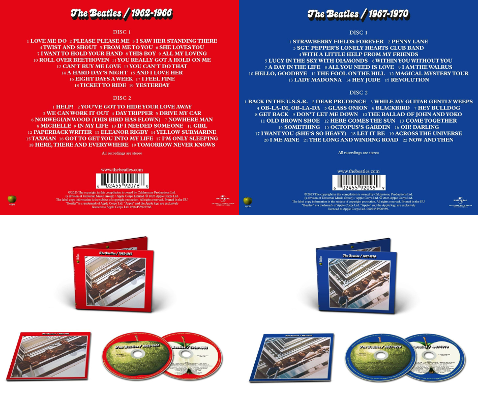 FRIDAY NOVEMBER 10, 2023 – The Beatles’ 1962-1966 (‘The Red Album’) and 1967-1970 (‘The Blue Album’) collections will be released in 2023 Edition packages by Apple Corps Ltd./Capitol/UMe. Since their first incarnations appeared 50 years ago, these albums have introduced successive generations to The Beatles’ music. Now, both collections’ tracklists have been expanded, with all the songs mixed in stereo and Dolby Atmos. New 4CD and 180-gram 6LP vinyl collections pair ‘Red’ and ‘Blue’ in slipcased sets. The UK single version of “Love Me Do” now kicks off 1962-1966 (2023 Edition) and “Now And Then” is featured on 1967-1970 (2023 Edition) to complete the career-spanning collections.