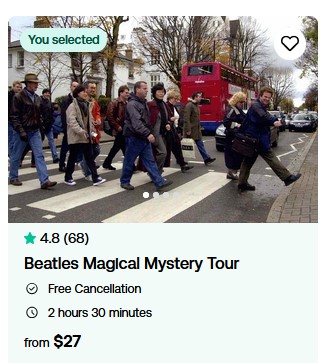 Richard Porter’s Magical Mystery tour travels mainly around the Soho and Mayfair districts of London. You’ll see Paul McCartney’s London offices, the studio where The Beatles recorded “Hey Jude”, the theater where Beatlemania began, the former Apple headquarters at 3 Savile Row – the site of the Beatles rooftop concert in 1969, where John met Yoko for the first time, and Abbey Road Studios.